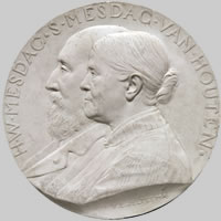 In december 1907 is hij weer thuis bij zijn ouders. En, o ja, dan ontvangt hij nog de gouden erepenning voor de Prix de Rome van 1902. De voorzijde van de penning is ontworpen door J.C. Wienecke. De tekst op de keerzijde luidt WEDSTRIJD IN DE BEELDHOUWKUNST AAN DE RIJKS AKADEMIE VAN BEELDENDE KUNSTEN. De diameter bedraagt 5 cm, in de rand is het monogram JCW van de ontwerper afgedrukt. Geen penning waar een kunstopleiding erg trots op kan zijn. |