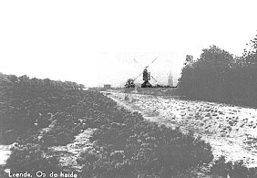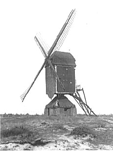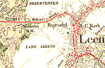 twijfel De aquarel beeldt onmiskenbaar de heimolen van Leende uit, en het olieverfschilderij is op zijn beurt onmiskenbaar gebaseerd op de aquarel. Het standpunt van de schilder voor de aquarel lijkt ergens langs het brede exploitatiepad te zijn dat ook op een foto van rond 1930 te zien is (Fig. 6). Het onderstel van de molen is duidelijk ongedekt op Taco's aquarel, en iets minder duidelijk op het olieverfschilderij, beide daterend uit de jaren voor 1900, in tegenstelling met de foto van rond 1930. Maar zoiets wisselde nogal eens; soms hield een mulder kippen in het onderstel. Taco heeft op de aquarel dus wel een kerk aan de horizon gezet, rechts van de drie grote bomen. Links van de molen, zowel op de foto als op de aquarel, steekt het dak van een huis boven de heuvel omhoog. Dat is dan ongetwijfeld ook weer hetzelfde dak als op het olieverfschilderij. Overigens heeft Mesdag voor dit laatste schilderij een romantischer heidepad geschilderd dan voor de aquarel, en hij heeft het landschap ook veel gedetailleerder uitgewerkt. Op een historische stafkaart van Leende (Fig. 7) laat zich een positie voor Taco's olieverfschilderij aanwijzen die de opgesomde kenmerken goed kan verklaren: bij de aanduiding 25,7 ongeveer 300 m links van de Heimolen. |