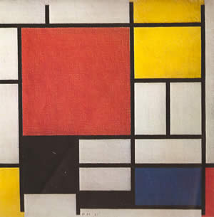 vrouwen niet schilderen kunnen ... Overigens, Piet Mondrian had gedurende zijn hele leven omgang met vriendinnen. Maar hij wilde zich niet binden uit vrees voor zijn onafhankelijkheid als schilder. Mondrian had stap voor stap de "natuur", de vormen uit de reële wereld, achter zich gelaten en pas vanaf 1921 exposeerde hij zijn befaamde composities met puur mathematische elementen: rechte lijnen, vlakken gevuld met primaire kleuren, in overeenstemming met de bovenstaande regels. Afb. 13. Hoewel hij beweert dat zijn schilderijen door intuïtie tot stand zijn gekomen, en hij daarna pas zijn theorie van het neoplasticisme heeft opgesteld, zijn die uitspraken over lijnen en kleuren al uit de jaren 1917 - 1919. |
