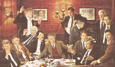 ![]() Afb. 7. Kik Zeiler, De Herenclub (schilderij 1992). Prominent Nederlands equivalent van een tijdloos, internationaal fenomeen. V.L.n.r. Duisenberg bankier,Van Mierlo politicus, Schat componist, Hofland journalist, Veltman dichter, Mulisch schrijver, Lammers politicus, De Leeuw musicus, Komrij literator, Van Dam politicus, Spoor journalist, Gruijters politicus, Henneman beeldend kunstenaar. |