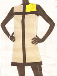 hij op de zwarte lijst van de nazi's. Wat kunnen we zeggen over het uit elkaar raken van Mondriaan en de Haagse School? Niet het publiek had genoeg van de molentjes en slootjes van de Haagse School, maar de schilder zelf was er op uitgekeken. Zijn invloed in de wereld van kunstenaars en ontwerpers is aanzienlijk, tot op de dag van vandaag. Kijk bijvoorbeeld naar enkele illustraties in de NRC van 29 november 2012. Afb. 5. En de jurk ontworpen door Yves Saint Laurent. Afb. 6. Zelfs een schilderijtitel zoals Pier en Oceaan kon de schrijver Oek de Jong inspireren. |