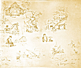 Op de collage van schetsen, zwaar vergeeld door langdurige blootstelling in een lijst aan het zonlicht, staat Rezzago links boven afgebeeld. Ook plaatsjes in de buurt, Ide, Donderen en de kerk van Vries staan er op. Taco zit er te schilderen met een hondje aan zijn voeten. Rechtsonder de signatuur G. Mesdag - van Calcar en, uniek voor Geesje, de datum: 21 september 1896. Maar dat was dan ook Taco's 67ste verjaardag. Cadeautje.
