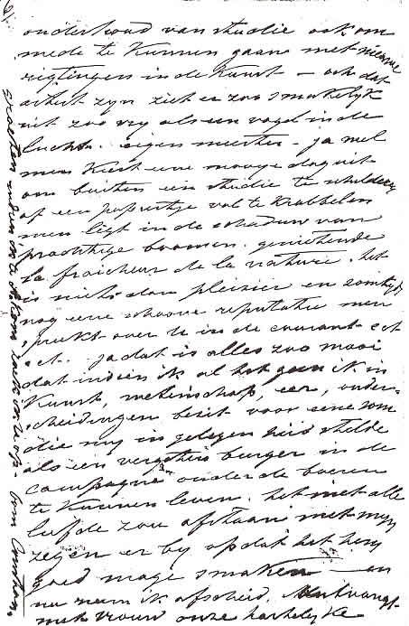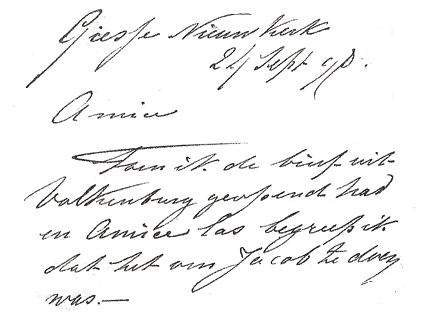 leraar-leerling van toepassing. Maar ook bij leeftijdgenoten waar hij vertrouwelijk mee omging, bijvoorbeeld de Ritsema's, ouders van de schilders Jacob en Coba, komt hij niet verder dan een afstandelijk Gabriel. Nu klinkt Gabriel natuurlijk wat intiemer dan de gemiddelde achternaam, omdat het toevallig identiek is met een voornaam. Bedriegelijk. In de brief, waarvan hiernaast een deel is gereproduceerd, betuigt Gabriel zijn medeleven met de ouders van de ernstig zieke Jacob, die als leerling een tijdlang bij hem ingewoond had op de Kanaalweg. |